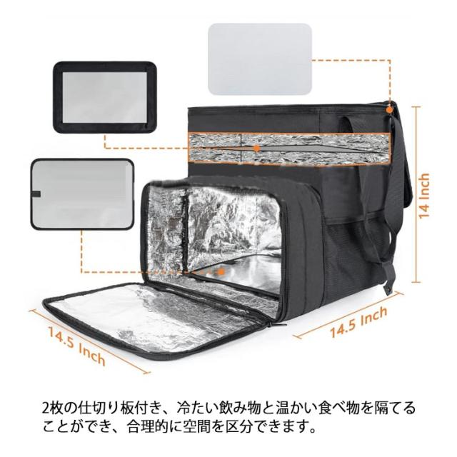 | 保温・保冷 配達に最適 デリバリーバッグ 防水 拡張可 表面は1680D高密度の防水生地設計、突然の雨でも安心できます。 デリバリーバックだけでな普段の買い物からピクニック、釣り、キャンプ等日常の様々なシーンで活躍できます。 厚い材料で構成されており、保温・保冷効果がより高いです。 2枚の仕切り板付き、冷たい飲み物と温かい食べ物を隔てることができ、合理的に空間を区分できます。 | |