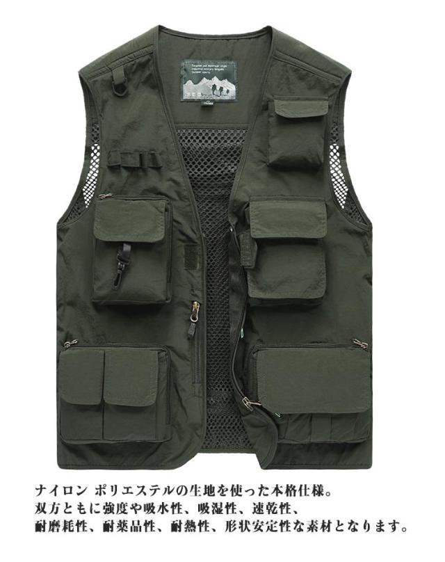 | ・機能性なんと15個のポケット、お釣りや撮影活動に大人気! ・通気性チュールやメッシュ素材だから夏向け通気性が抜群! ナイロン ポリエステルの生地を使った本格仕様。双方ともに強度や吸水性、吸湿性、速乾性、耐磨耗性、耐薬品性、耐熱性、形状安定性な素材となります。 通気性、防風性、速乾性、などがある多機能ベストです。 背中のメッシュと内側のメッシュ生地は高い通気性を発揮して、着心地はずいぶんよかった。 肩部分には柔らかい素材でカメラバッグやショルダーバッグを長時間しても肩こりしにくい、疲れにくいです。キャンプ、釣り、ウオーキング、山歩き撮影など色々なシーンで活躍してくれます。 | |