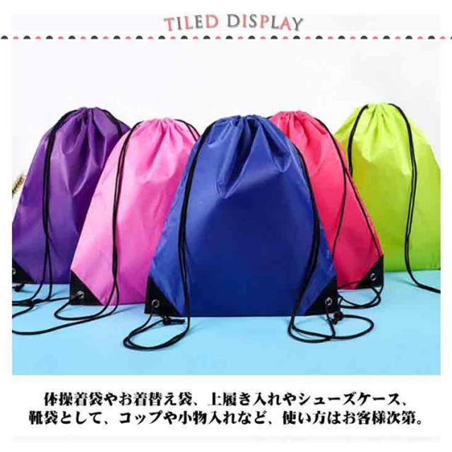 | 通園通学やちょっとしたお出掛けなどに便利な、無地の巾着袋です。 体操着袋やお着替え袋、上履き入れやシューズケース、靴袋として、コップや小物入れなど、使い方はお客様次第。 | |