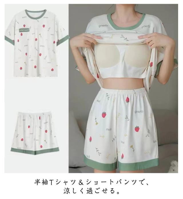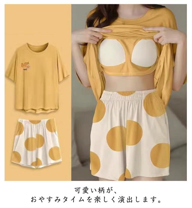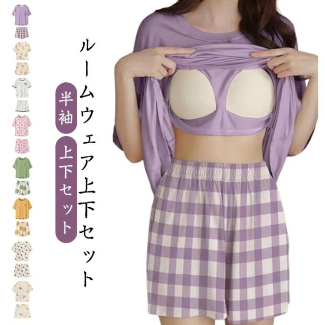 カップ付き セットアップ レディース 夏 ルームウェア パッド付き パジャマ Tシャツ ショートパンツ 上下セット 春 ルームウェア 薄手 かわいい ナイトウェア 部屋着 寝間着 ハーフパンツ