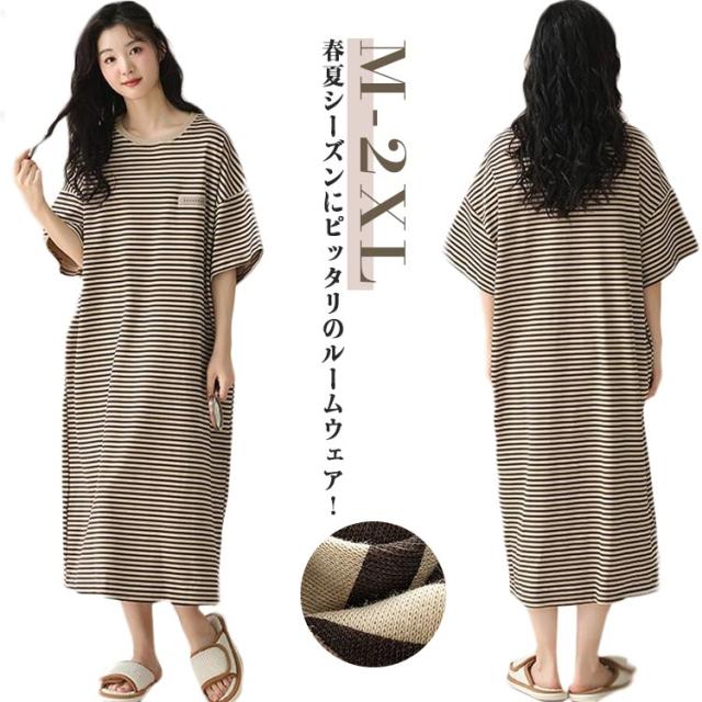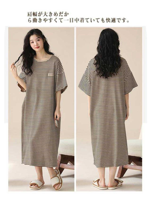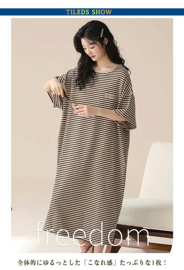 ルームウェア パジャマ ワンピース ゆったり レディース Tシャツ ワンピース ボーダー 半袖 春 夏 綿 部屋着 ルームウェア オーバーサイズ かわいい 体型カバー 大きいサイズ
