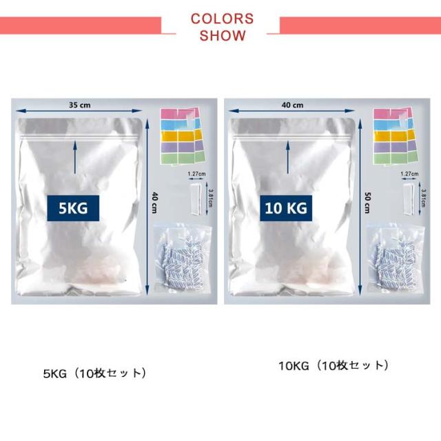 | サイズについての説明 | 5KG 35*40cm 10kg 40*50cm 23点セット内容:チャック付き袋10枚+脱酸素剤10個+ラベルシール2枚+スライダー1個 |