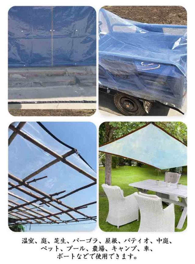 | 【防水シート】【2*2m 2*3m 2*4m 3*3m】 【透明シート】丈夫なPE製で、柔らかくて丈夫、引っ張りに強く、変形にくく、耐紫外線性と耐久性があります。 【ボタンホール付き】ロープなどで吊るしたり、バンドで固定したり、いろんな使い方があり、簡単に固定できます。 【補強のエッジ】補強されたエッジ全体に沿って配置されて、風に抵抗する性は強いです。 【収納しやすい】自由に曲げたり折りたたんだりでき、小さな収納スペースしか占有しません。 【多機能用途】温室、庭、芝生、パーゴラ、屋根、パティオ、中庭、ペット、プール、農場、キャンプ、車、ボートなどで使用できます。 | |