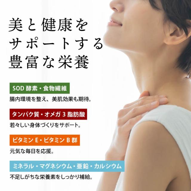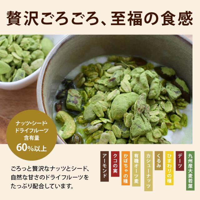 オートミール(オーツ麦(アメリカ))、デーツダイス(デーツ (トルコ)、米粉)、ミックスシード(かぼちゃの種(中国)、ひまわりの種(中国)、クコの実(中国))、ミックスナッツ(くるみ(アメリカ)、アーモンド(アメリカ)、カシューナッツ(インド))、大麦若葉(九州産大麦若葉)、(一部にくるみ・アーモンド・カシューナッツを含む)