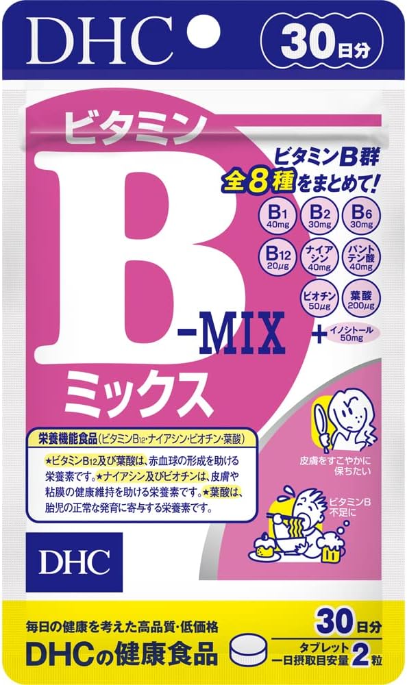 DHCの『ビタミンBミックス』は、ビタミンB1、B2、B6、B12、ナイアシン、パントテン酸、ビオチン、葉酸のビタミンB群全8種類にイノシトールをプラスした総合サプリメントです。
