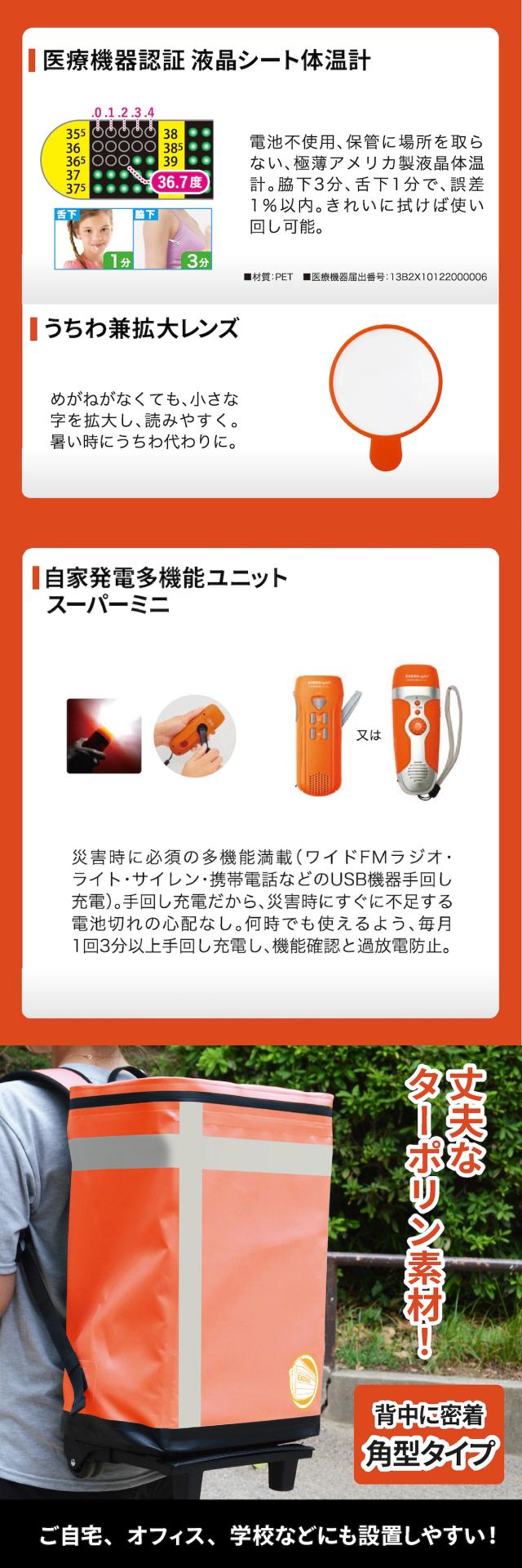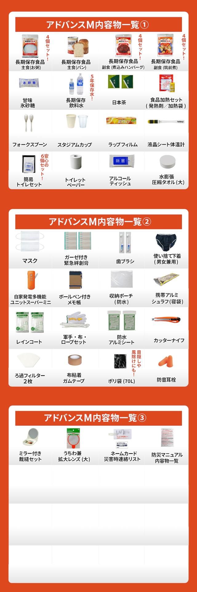《アドバンス》主食x1、甘味物・氷砂糖x1、保存飲料水(500ml)x1、お茶x1、フォークスプーンx1、FMラジオ付多機能ライトx1、ボールペン付メモ帳x1、マスクx1、トイレットペーパーx1、簡易トイレセット(3枚入)x1、歯ブラシx1、包帯x1、ガーゼ付救急絆創膏x2、医療用体温計x1、圧縮タオル(小)x1、アルミシートx1、収納ポーチx1、ろ過フィルターx2、布粘着テープx1、軍手・笛・ロープセットx1、雨衣x1、カッターナイフx1、ごみ袋x1、アルミシェラフx1、手鏡付裁縫セットx1、名札x1、防災マニュアル・内容物一覧x1