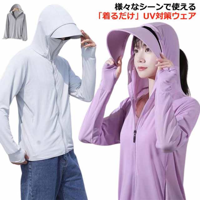 UV パーカー フード 大きめ つば フルフェイス 長袖 ラッシュガード UVカット パーカー 冷感 日よけ UPF50+ 取り外せる ツバ 指穴 ジップアップ 薄手 吸湿 速乾 通気 メンズ レディース 薄手 アウトドア BBQ 暑さ対策
