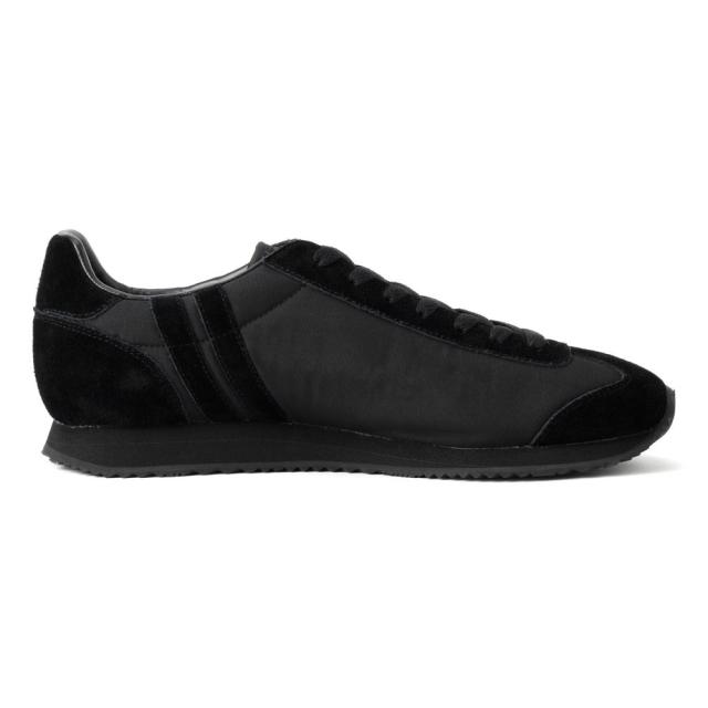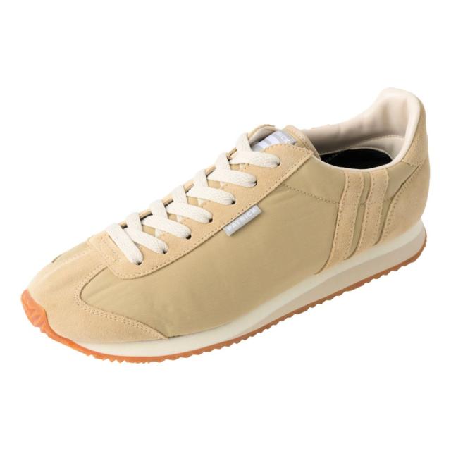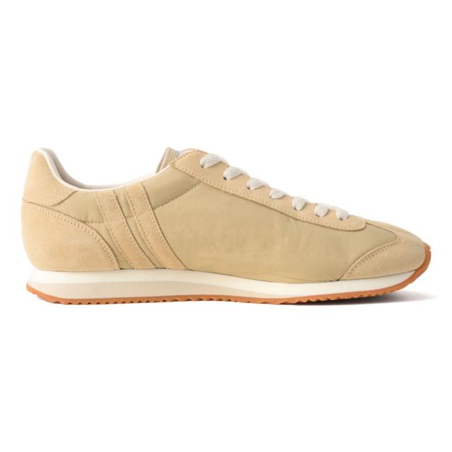 アッパーには、コットンを混合したポリエステル素材を採用。裏面には透湿防水フィルムがラミネート加工されており、通気性と撥水性を両立させています。さらに、補強部分には撥水ベロアを合わせ、デザイン性と耐水性を向上させています。耐久性があり、日常のシーンにも最適です。
