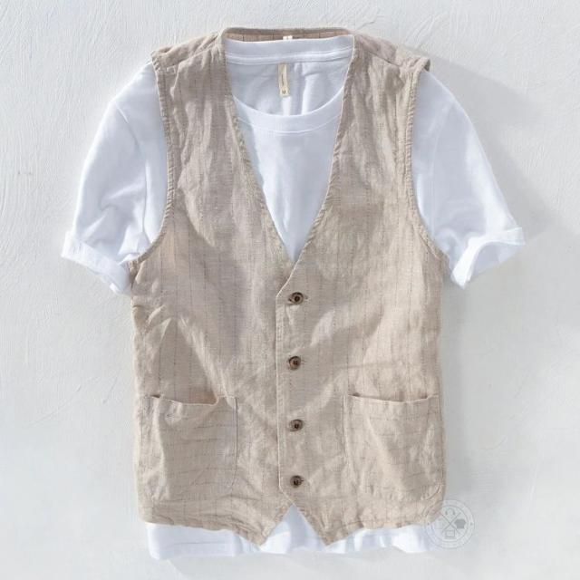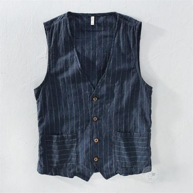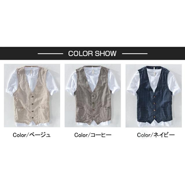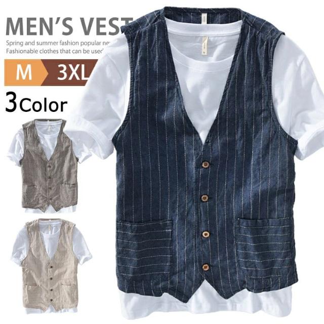 サマーベスト メンズ 綿麻 春夏 ジレベスト ベスト ゴルフ シニア ストライプ柄 おしゃれ ビジネス ボタンベスト コットンリネン 前開きベスト カジュアル キレイめ ダンス リゾート 爽やか 通気性 男性用 普段着 通勤 トップス 秋 春服 夏服 父の日