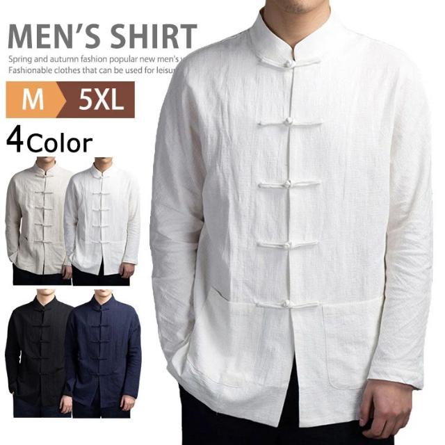 【爆買】チャイナ服 チャイナシャツ メンズ 綿麻シャツ 長袖シャツ カジュアルシャツ リネンシャツ スタンドカラー カンフーシャツ バンドカラー チャイナボダン カジュアルコーデ トップス おしゃれ 男性 唐装 漢服 太極拳服 普段着 中華 中華服 演出服 春物 秋服