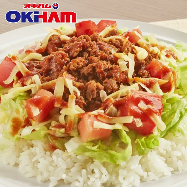 タコスミートのピリ辛味とチーズの濃厚さ、あと味をさっぱりとさせるレタス、トマトの組合せが抜群のタコライスをご自宅で!オキハム|タコライス