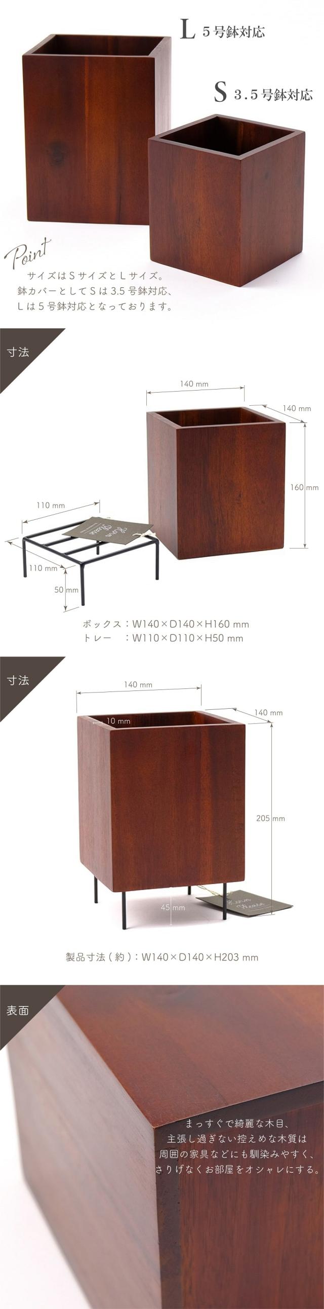 シックなブラックカラーのアイアン製のスノコにボックス本体を乗せるだけ。分離が簡単に出来る仕様で、木部のみでの使用もできます。使用しないトレーはボックス内部に入れて飾りたい植物のスノコとして高さの底上げに利用できる2通りの使い方が出来るデザインになっています。Sサイズは3.5号相当の鉢カバーとしてご使用いただけます。
