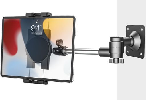 【超安定】スタンド全体がアルミ合金素材でできており、スタンドが常に安定していて、画面に触れてもデバイスが揺れないようになっています。 また、スタンドのロングアームは調節可能なので、壁に取り付ければ、使わないときは場所を取らずに簡単に調節できます。 ?ヒント:このウォールマウントタブレットホルダーを取り付けるには、壁にドリルで穴を開ける必要があります。