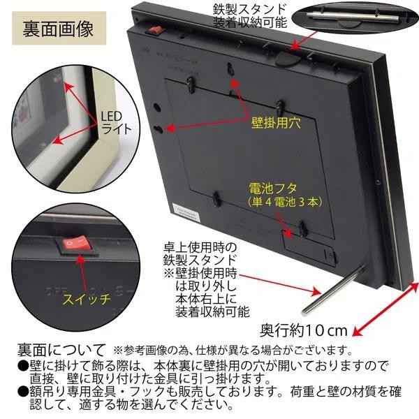 | 仕様 | 壁掛・卓上両用(スチールスタンド付き)・1mmダブルマット付・音センサー付(音に反応し、自動的に1分間点灯します。) |