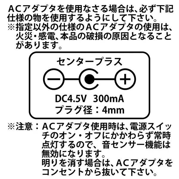 | LEDライトでお気に入りの1枚をライトアップしてくれる、スペシャルフォトフレーム。 ACアダプタを使用なさる場合は、必ず「センタープラス・プラグ径4mm・DC4.5V・300mA」の物を使用するようにして下さい。 ※指定以外の仕様のACアダプタの使用は、火災・感電、本品の破損の原因となることがあります ※注意:ACアダプタ使用時は、電源スイッチのオン・オフにかかわらず常時点灯するので、音センサー機能は無効になります。明りを消す場合は、ACアダプタをコンセントから抜いて下さい |