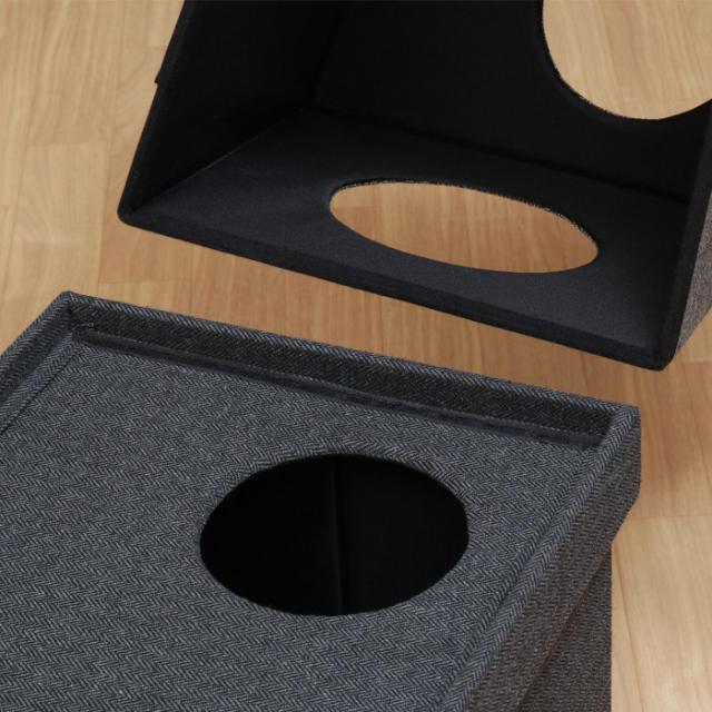 商品詳細:バイカラーデザインの2段キューブハウスです。キューブ内部と天井部分には穴が開いており、上下を自由に行き来することができます。穴の位置も自由に組み替えができるので、連結を変えて遊ぶことも♪面ファスナー仕様で簡単に取付けできます。 生産国:中国 素材・材質:MDF、ポリエステル 商品サイズ:全体:幅375×奥行375×高さ740mm、開口部(前面):直径175cm、開口部(蓋部):直径145cm 重量:5.5kg 仕様:カラー:グレー/ブラック耐荷重(全体):8kg