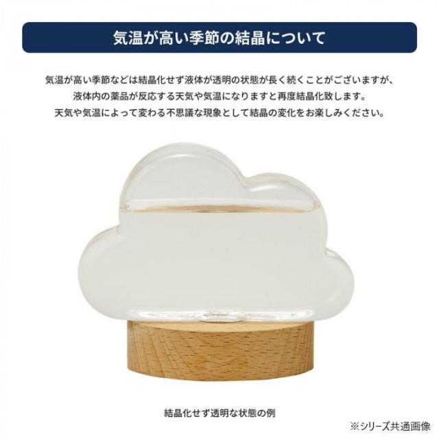 | もくもくとした雲の形が可愛い雲形のストームグラス。透明なガラスの中で姿を変える結晶と空を眺めているようなスヌーピーとウッドストックが可愛いインテリアアイテムです。お部屋に置きやすいコンパクトなサイズ感で、ギフトにもぴったり。 ■ストームグラスの結晶について ※商品によって個体差はありますが、室温およそ5度〜25度の範囲で結晶化をお楽しみ頂けます。それ以外の室温のもとでは、結晶化はせずに、液体も透明のままです。適切な温度帯になると結晶化するようになります。 ※暑い季節にご購入頂いた際、結晶が見られず心配される方もいらっしゃるかと存じますが、平らな場所、日陰に設置していただき、ストームグラスに丁度良い気温・天気になるのをお待ちくださいませ。 ※本体を振り液体が混ざってしまうと結晶が発生しにくくなります。本体は揺らさずにお使い下さい。 ※開梱してから周囲の環境になじむまでに1週間前後の時間が必要とされています。 |