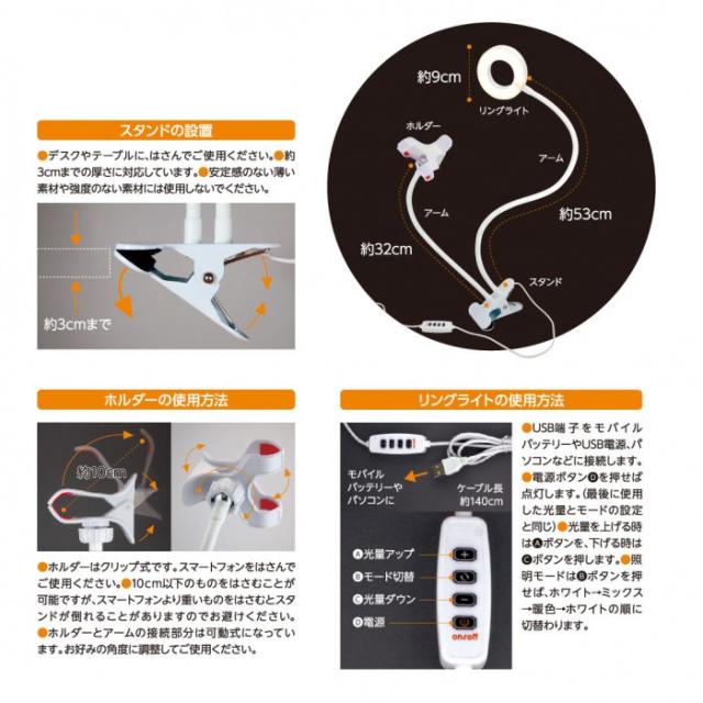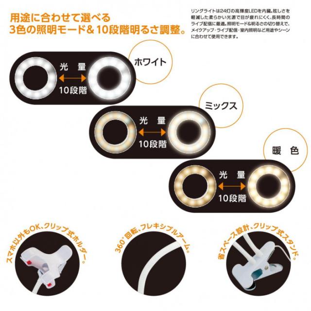 | リングライトは24灯の高輝度LEDを内蔵しています。眩しさを軽減した柔らかい光源で目が疲れにくく、長時間のライブ配信に最適。照明モード&明るさの切り替えで、メイクアップ・ライブ配信・室内照明など、用途やシーンに合わせて使用できます。USBをモバイルバッテリーやPCに繋げて給電も楽々です。 ※製品のお手入れの際には柔らかい布で拭いてください。 ※直射日光の当たる場所に保管しないでください。 ※小さなお子様の手の届かない場所に保管してください。 |