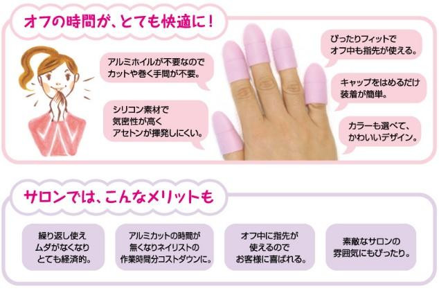 | ぴったりフィットで、オフ中も爪先が使えます。ホイル不要。密閉式。簡単装着。 【ご使用上の注意】 ・オフ中に指先を使う場合、アセトンが溢れて周囲に付着しないようご注意ください。(変色や溶解の原因になります) ・伸縮性のあるシリコン素材のため、指のサイズ違いにも対応していただけます。 ※尚、小指など細くてフィットしない場合はコットンの量などで調整してください。 ・締めつけがきつい場合は、指を奥まで入れず少し手前でご使用ください。 ・使用後は水洗いし乾燥させてください。 ・高温や直接日光を避け、乳幼児の手の届かない所に保管してください。 |