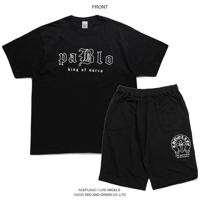 Tシャツとスウェットハーフパンツの上下セット。トップスにはコロンビアの麻薬王としてその名前を世界に轟かせた「Pablo Escobar」 (1949 - 1993) 、ボトムスにはウエッサイを代表する伝説的ラップ・アーティストの「タトゥー」をドロップ。