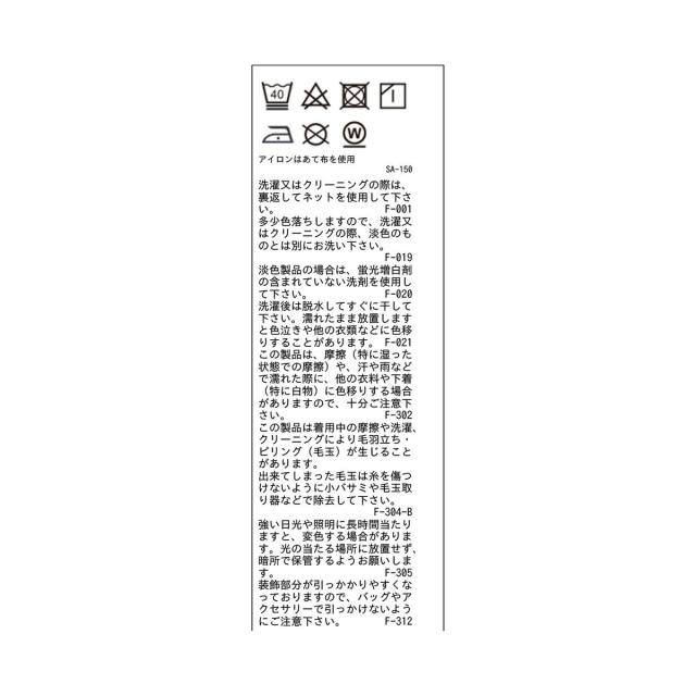 ■お手入:洗濯機|漂白不可|タンブル乾燥不可|自然乾燥|アイロン仕上げ可|ドライ不可|ウエットクリーニング可