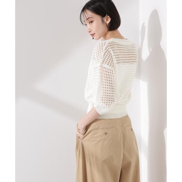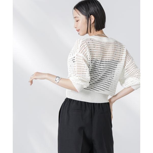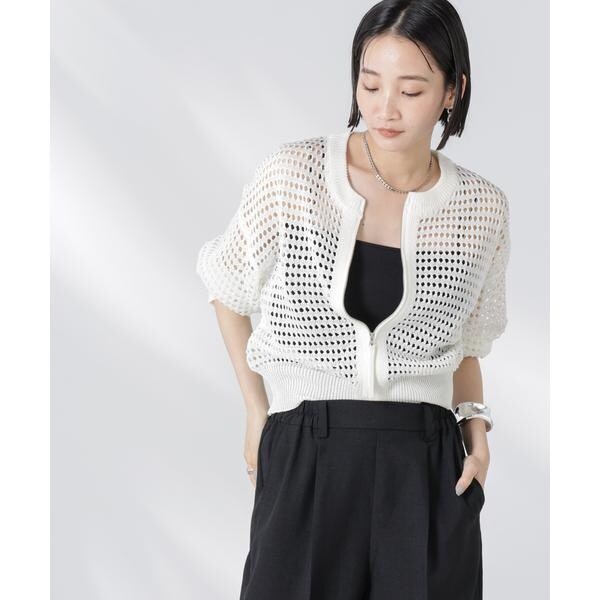 着るだけでトレンド見えするメッシュ柄のニットブルゾン。羽織としてもジップを閉めてプルーバーとしても着回せる万能デザイン。ショート丈の程よくゆとりのあるサイジングで、バランス良くすっきり着こなせるのも魅力的。インナーには半袖カットソーや、カップ付きのキャミソール、タンクトップ、ワンピース等を合わせても素敵です。