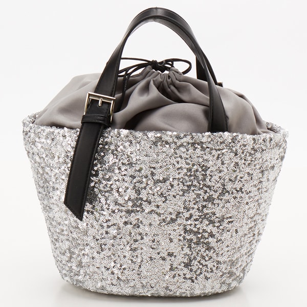 スパンコールを全面にあしらったかごバッグ。