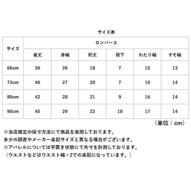 | サイズ | [ベビー] ・66cm ・73cm ・80cm ・90cm ※サイズについて詳細は、商品画像の中にあるサイズ表をご覧くださいませ。 |