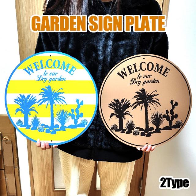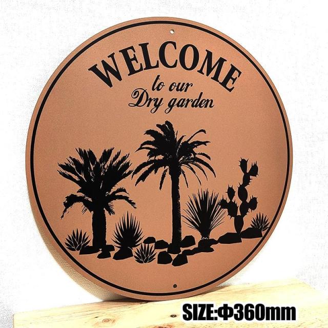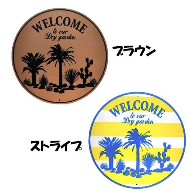 ブリキ看板 WELCOME サインプレート ガーデン おしゃれ 丸型 ブラウン ストライプ ウェルカム ヤシの木 植物 ガーデニング 壁飾り 庭 ディスプレイ 目立つ 可愛い アメリカン