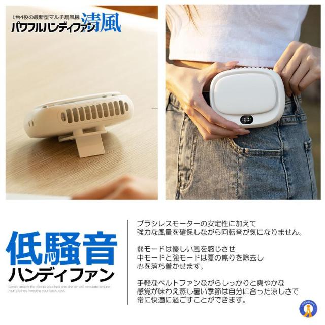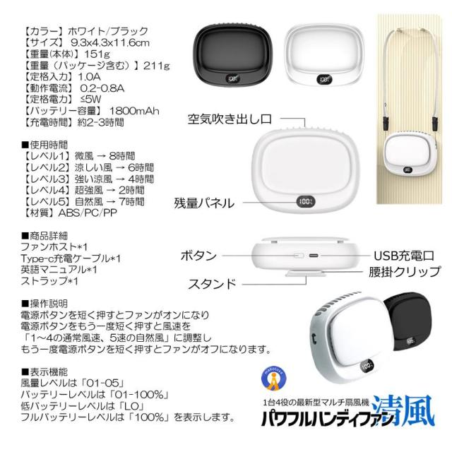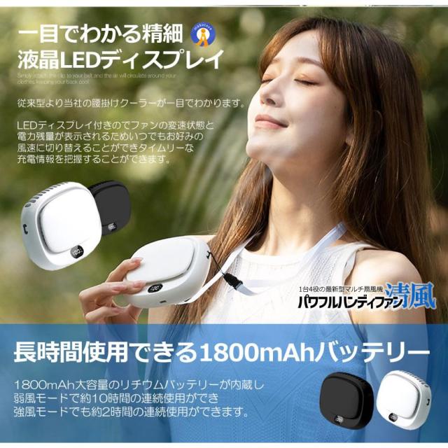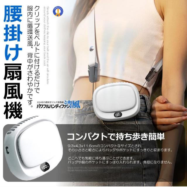 腰掛け扇風機 ベルトファン ハンディファン LED残量表示 大容量 クーラー 超強風 5段階風量 首掛け扇風機