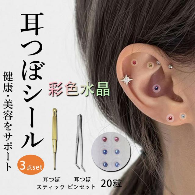 耳つぼシール20粒| 彩色水晶粒+耳つぼゴールドスティック+先曲がりピンセット | フェイククリスタル 耳つぼジュエリー 美容・健康 小顔効果 ダイエット効果 ストレス緩和 美白・肌ケア 関節痛緩和 筋肉疲労時軽減 食欲抑制 疲労回復 耳ツボ ジュエリー ピアス