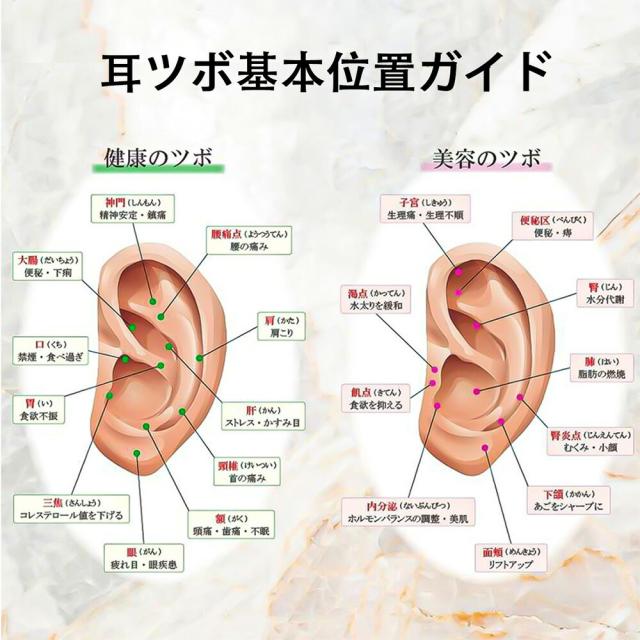 必ず効果があるとは言えませんが、耳つぼの詳しい場所の写真ものさせていただいておりますので、新しい方法で、悩み解決をサポートする耳つぼシールをご利用ください。 ■必ず注意事項をお守りいただき、ご使用ください。 | ||||||||||||||