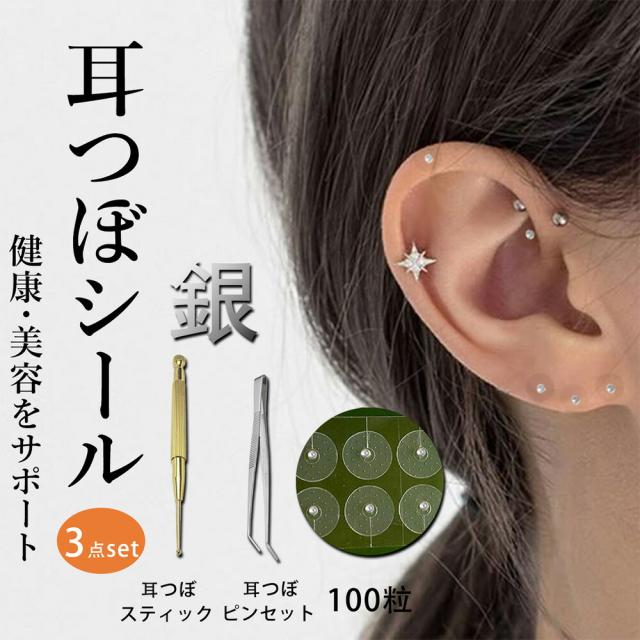 耳つぼシール100粒| シルバー粒+耳つぼゴールドスティック+先曲がりピンセット | 銀粒 耳つぼジュエリー 美容・健康 小顔効果 ダイエット効果 ストレス緩和 美白・肌ケア 関節痛緩和 筋肉疲労時軽減 食欲抑制 疲労回復 耳ツボ ジュエリー ピアス