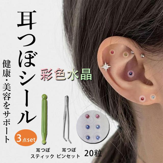 耳つぼシール20粒| 彩色水晶粒+耳つぼ 翡翠風(ヒスイ)スティック+先曲がりピンセット | フェイククリスタル 耳つぼジュエリー 美容・健康 小顔効果 ダイエット効果 ストレス緩和 美白・肌ケア 関節痛緩和 筋肉疲労時軽減 食欲抑制 疲労回復 耳ツボ ジュエリー ピアス