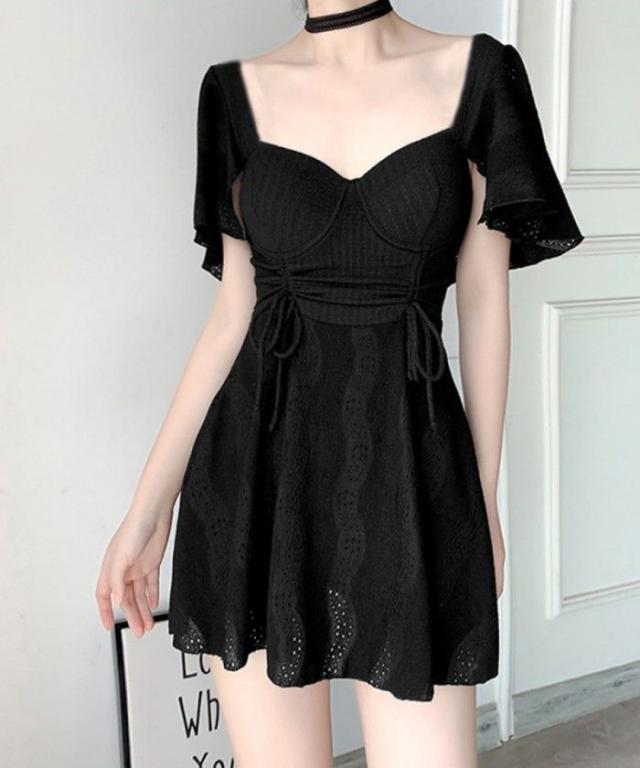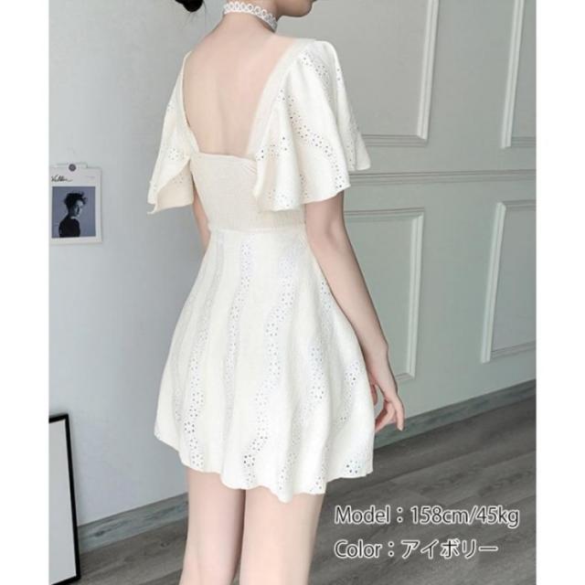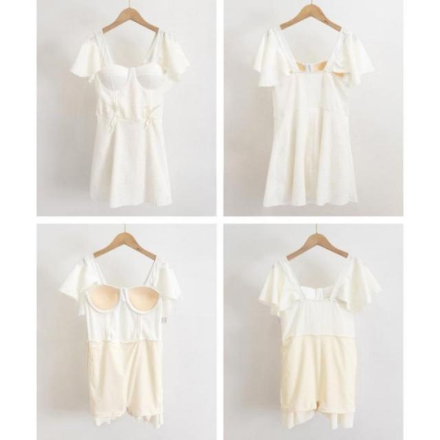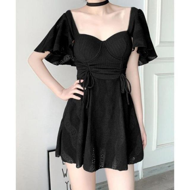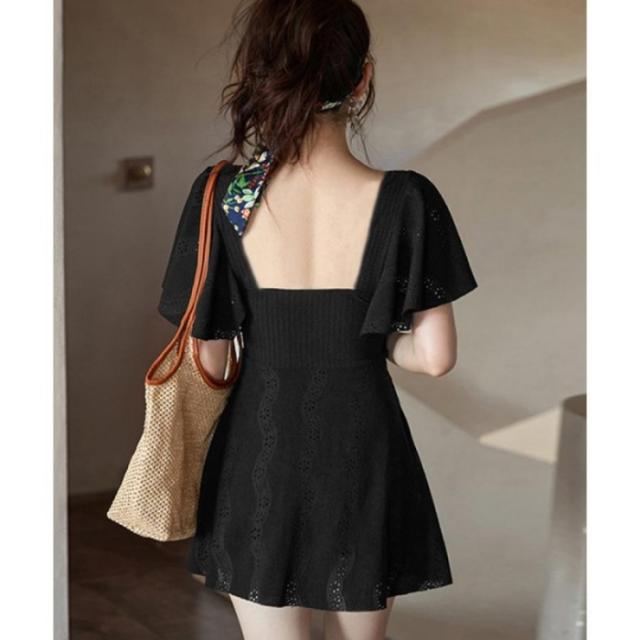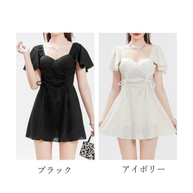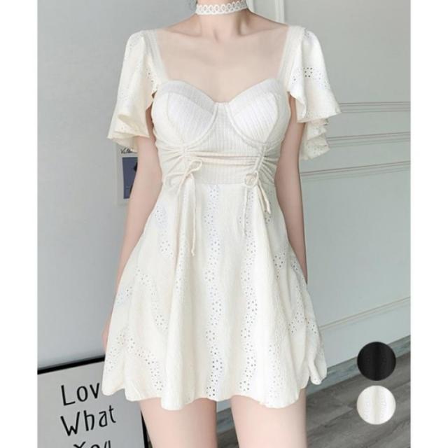 フリル袖フレアワンピース水着 着やせ 大人可愛いレース水着 ハイウエス露出控えめ水着 お洒落ビーチウェア 清楚上品韓国風