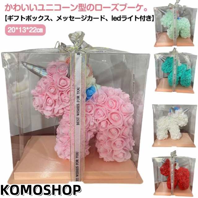| かわいいユニコーン型のローズブーケ。【ギフトボックス、メッセージカード、ledライト付き】 素材:PEやポリエステルの素材で、ハンドメイド製品、また、製造都合によって、ユニコーンリボンの仕様は特に決まてません。ご了承ほどお願いいたします。 絶妙なユニコーンの形、花びらの重ねや咲いた姿はまるで本物の薔薇の花のようです。お部屋に装飾品として暖かい雰囲気を与えますし、大切な人へのプレゼントとしても適切です! 【適用場合】新築、卒業祝い、誕生日、母の日、バレンタインデー、クリスマス、昇進、退職、結婚記念日、送別会、発表会、周年祝い、ウェディングなどお祝い時のユニークなプレゼント用に適用です。 | |