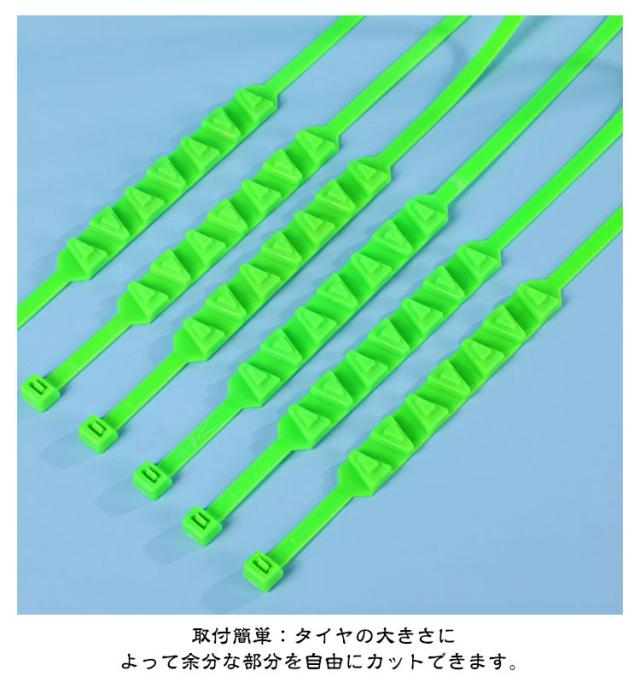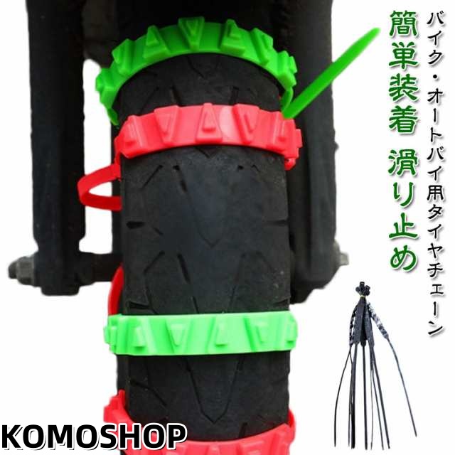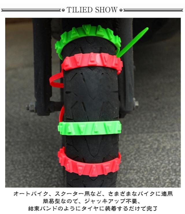| 【バイク・オートバイ用タイヤチェーン 40本セット】 突然の豪雪にも即対応、冬の必需品! 滑り止め性:雪の多い状況でも車両をスムーズに移動可能。 オートバイク、スクーター用など、さまざまなバイクに適用 簡易型なので、ジャッキアップ不要、結束バンドのようにタイヤに装着するだけで完了 取付簡単:タイヤの大きさによって余分な部分を自由にカットできます。 車両移動不要・ジャッキアップ不要・ツールも必要ありません、女性でも簡単に取り付け可能! タイヤチェーンは、タイヤへの傷つけにくさを維持したまま、雪の泥や砂に優れたグリップを提供します。 耐摩耗性、耐低温性、耐久性に優れた高品質のナイロン素材を使用。 季節を問わず、冬、雪のときだけではなく、スキー、クロスカントリー、野外冒険、山岳運転にも。 | |