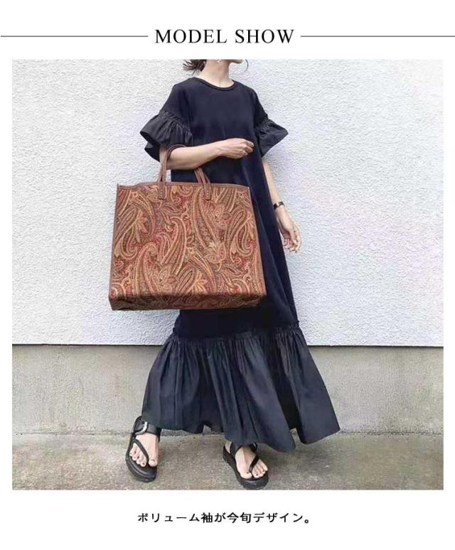 | 切り替えのデザインが個性的でおしゃれなマキシワンピース。 ボリューム袖が今旬デザイン。 ゆったりとしたシルエットで体型を気にせず着用できます。 | |