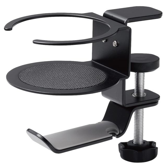 ■ヘッドホンとドリンクをまとめて収納できる、ドリンクホルダー付きのヘッドホンスタンドです。 ■ヘッドホンのハンガー部は360度回転可能でデスク下に収納できるので、使用したいときだけデスク下からヘッドホンを取り出すことができます。 ■クランプ式で、デスク下にしっかり取り付けられます。 ■天板厚み約50mmまでのデスクに対応します。 ■直径約70mmまでのドリンクを置くことができます。 ■ハンガー部にはプラグやコードを引っ掛けることができるフックが付いています。