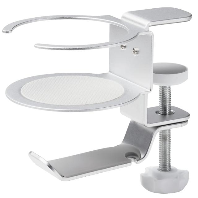 ■ヘッドホンとドリンクをまとめて収納できる、ドリンクホルダー付きのヘッドホンスタンドです。 ■ヘッドホンのハンガー部は360度回転可能でデスク下に収納できるので、使用したいときだけデスク下からヘッドホンを取り出すことができます。 ■クランプ式で、デスク下にしっかり取り付けられます。 ■天板厚み約50mmまでのデスクに対応します。 ■直径約70mmまでのドリンクを置くことができます。 ■ハンガー部にはプラグやコードを引っ掛けることができるフックが付いています。