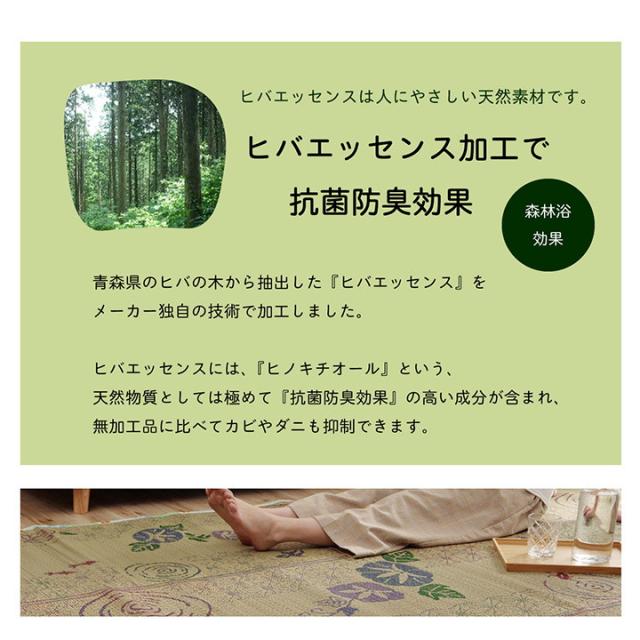 人気の猫と夏の定番の金魚をデザインしたい草ラグです。コンパクトに三つ折りで畳めて省スペースにも収納できます。い草には空気の自然浄化作用、湿度の調節作用などがあります。い草にヒバエッセンス加工を施しています(抗菌防臭効果)。青森県のヒバの木から抽出した「ヒバ油」をメーカー独自の技術で商品に加工しました。「ヒバ油」には、ヒノキチオールという天然物質としては極めて抗菌性の高い成分が含まれ、医療や食品など多分野で利用研究が進められています。裏は滑り止め不織布付きで、滑る心配がありません。
