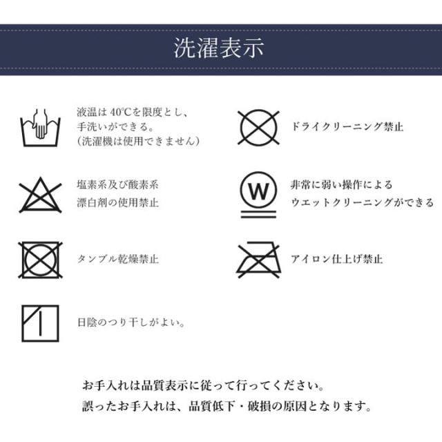 40℃以下の水温で弱い手洗いで洗濯してください。(洗濯機は使用できません。) 干し方=日陰のつり干しがよい。