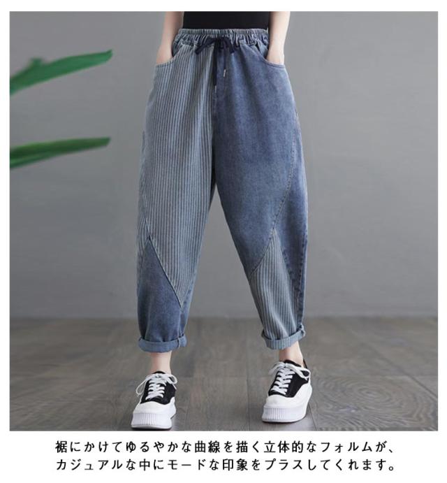 デニム ハイウェスト デニムパンツ デニム コクーンパンツ パッチワーク カーブパンツ サルエルパンツ ボトム カーブ ワイドパンツ ストライプ柄 春 切り替え 夏 レディース パンツ ジーンズ 薄手 軽量 ゆったり