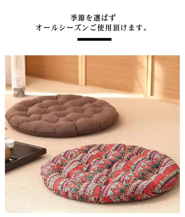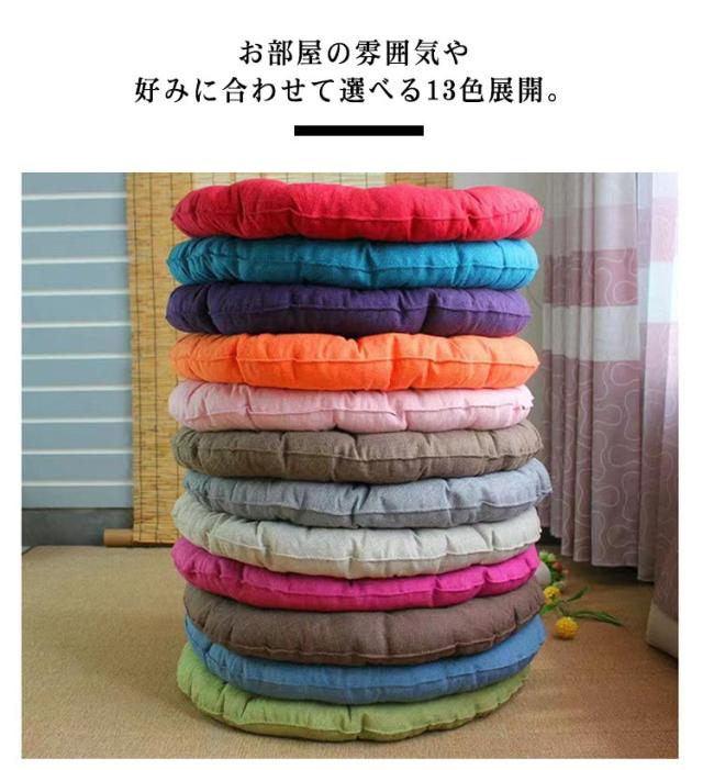 | おしゃれな丸型綿麻座布団! 品質のいい綿麻素材で通気性も優れてお座り心地抜群です。 適度な柔らかさ、座る時に、体圧を吸収、分散して身体を支えます。 お部屋の雰囲気や好みに合わせて選べる13色展開。 季節を選ばずオールシーズンご使用頂けます。 | |