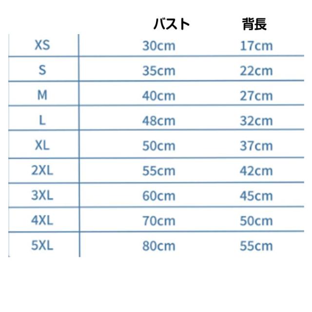 | サイズについての説明 | 詳しくは写真の通り。 XS:おすすめ体重0.5-1.5kg S:おすすめ体重1.5-2.5kg M:おすすめ体重3-4kg L:おすすめ体重4-5kg XL:おすすめ体重5.5-6.5kg 2XL:おすすめ体重6.5-9kg 3XL:おすすめ体重9-14kg 4XL:おすすめ体重14-19kg 5XL:おすすめ体重19-24kg ※サイズ表の実寸法は商品によって1-3cm程度の誤差がある場合がございます。 |