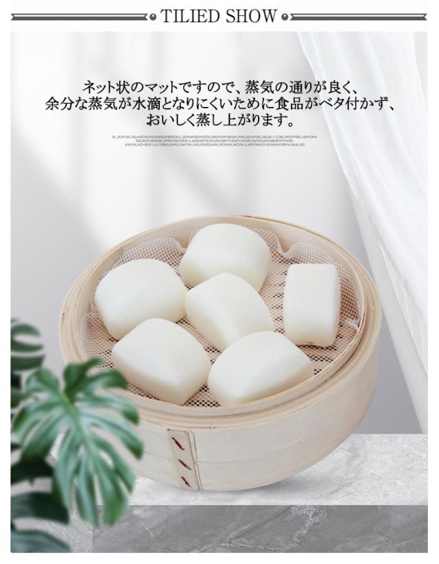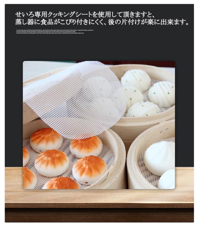 | 【10枚入り】 繰り返し使えるシリコン素材の蒸籠用クッキングシート。 ネット状のマットですので、蒸気の通りが良く、余分な蒸気が水滴となりにくいために食品がベタ付かず、おいしく蒸し上がります。 せいろ専用クッキングシートを使用して頂きますと、蒸し器に食品がこびり付きにくく、後の片付けが楽に出来ます。 肉まん、シュウマイ、茶碗蒸しや、餅米、赤飯などその他さまざまな蒸し料理に最適です。 | |