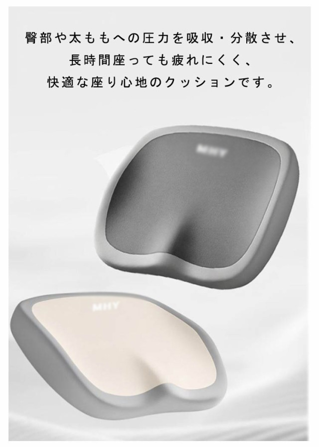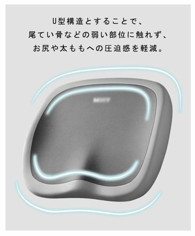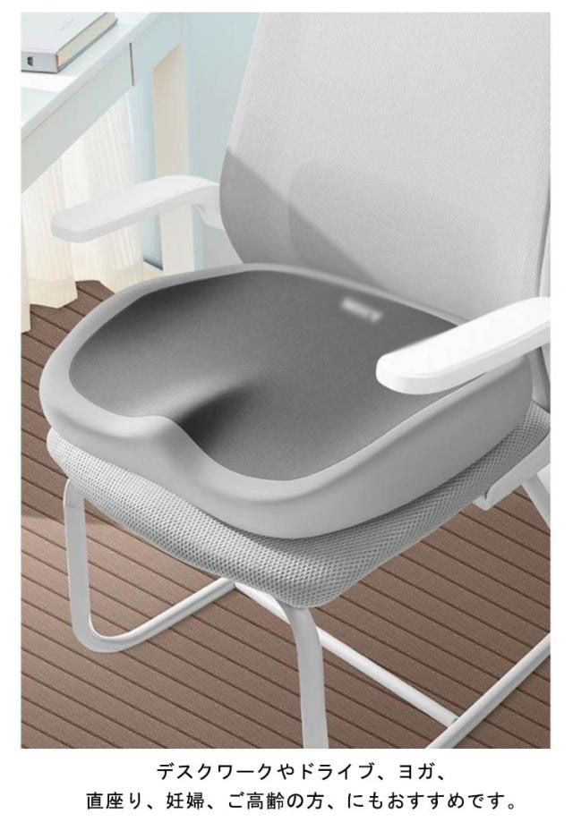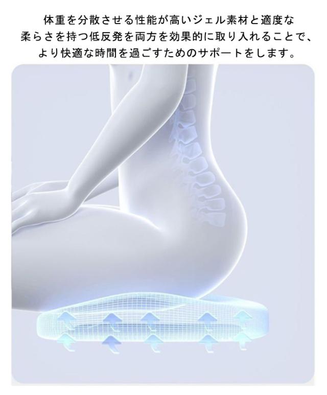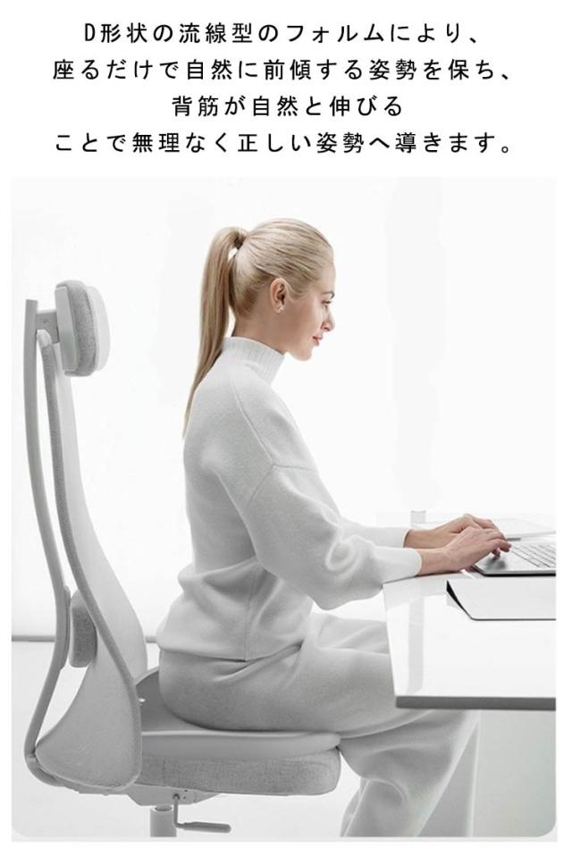| D形状の流線型のフォルムにより、座るだけで自然に前傾する姿勢を保ち、背筋が自然と伸びることで無理なく正しい姿勢へ導きます。 体重を分散させる性能が高いジェル素材と適度な柔らさを持つ低反発を両方を効果的に取り入れることで、より快適な時間を過ごすためのサポートをします。 U型構造とすることで、尾てい骨などの弱い部位に触れず、お尻や太ももへの圧迫感を軽減。 臀部や太ももへの圧力を吸収・分散させ、長時間座っても疲れにくく、快適な座り心地のクッションです。 デスクワークやドライブ、ヨガ、直座り、妊婦、ご高齢の方、にもおすすめです。 | |