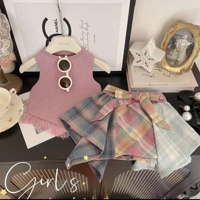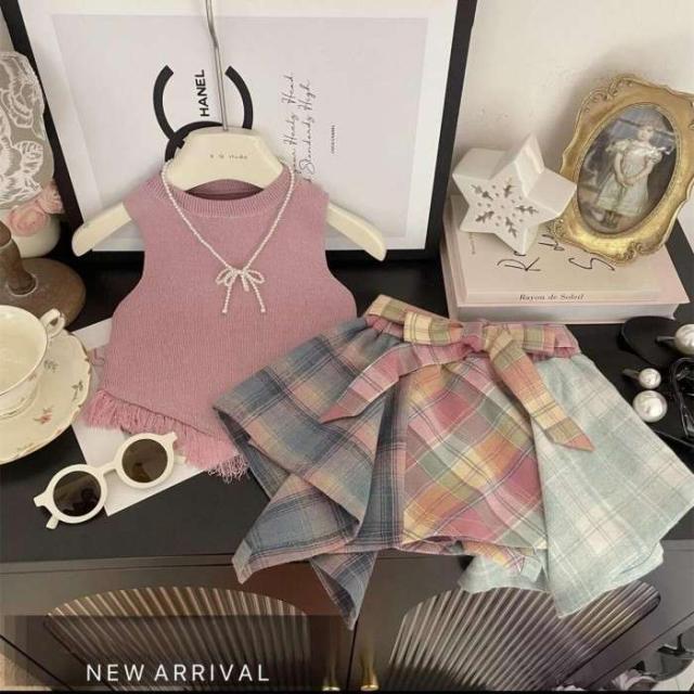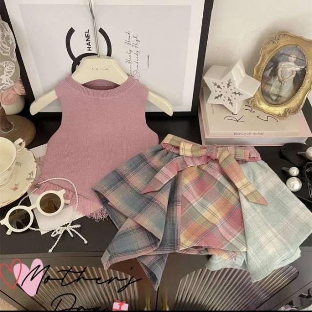 女の子 キッズ服 子供服 ピンク チェック柄スカート 袖なし トップス 森ガール系 2点セット お出掛け 夏 新作 可愛い 新品 韓国風 1-6歳