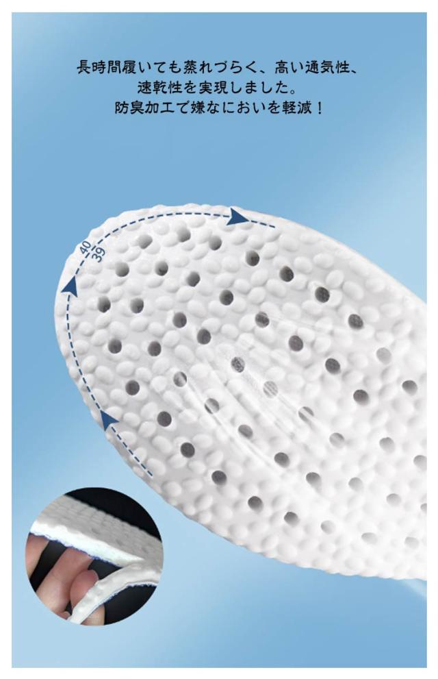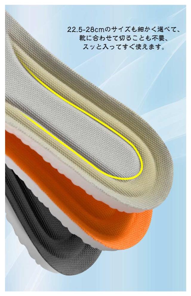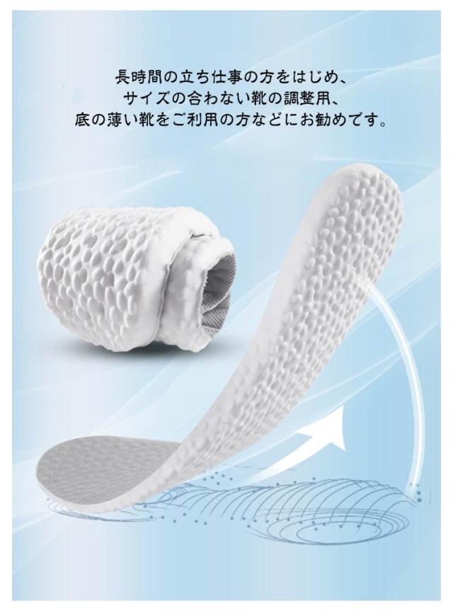 | 柔らかくクッション性に優れた、衝撃吸収を実現したインソールです♪ 長時間履いても蒸れづらく、高い通気性、速乾性を実現しました。防臭加工で嫌なにおいを軽減! 22.5-28cmのサイズも細かく選べて、靴に合わせて切ることも不要、スッと入ってすぐ使えます。 足の裏の衝撃も和らいでいますし、へたれなくとても履き心地がよく、長時間履いても疲れません。 長時間の立ち仕事の方をはじめ、サイズの合わない靴の調整用、底の薄い靴をご利用の方などにお勧めです。 | |