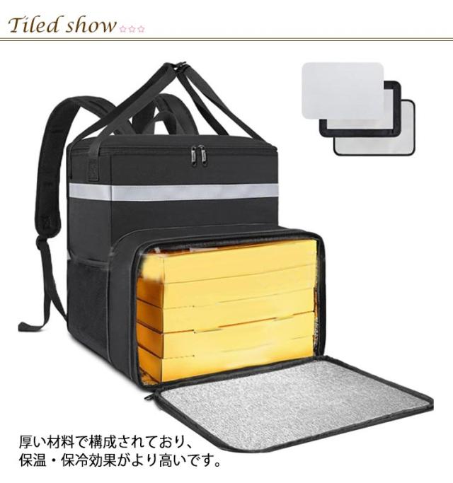 | 保温・保冷 配達に最適 デリバリーバッグ 防水 拡張可 表面は1680D高密度の防水生地設計、突然の雨でも安心できます。 デリバリーバックだけでな普段の買い物からピクニック、釣り、キャンプ等日常の様々なシーンで活躍できます。 厚い材料で構成されており、保温・保冷効果がより高いです。 2枚の仕切り板付き、冷たい飲み物と温かい食べ物を隔てることができ、合理的に空間を区分できます。 | |